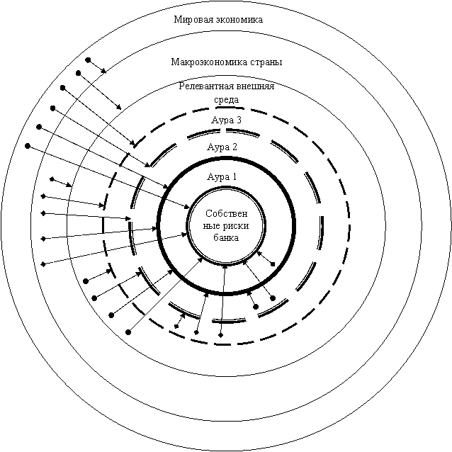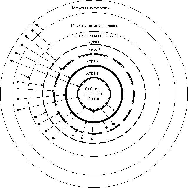 С точки зрения банка как виртуального холдинга его связи со средой многообразны и многоуровневы: так или иначе, на его успех может повлиять множество объектов. Любая систематизация этих объектов и связей между ними может оказаться полезной. Представляется, что все сказанное в этой главе о среде обитания банка можно представить в виде «банко-центрической»68 картины (рисунок 11). Все активные элементы внешней среды, упоминавшиеся с разных точек зрения ранее, полезно разложить по «небесным сферам» мира банка, которые интересны ему по-разному, и с которыми банк общается по-разному. Более того, можно считать, что каждая из концентричных сфер окружения банка в той или иной степени образует границу виртуального холдинга, фактически образующегося вокруг банка, и рисками которого так или иначе приходится управлять банку. Реальная и подробная конфигурация центростремительных и центробежных связей банка с этими сферами является уникальной для каждого банка, подобно отпечаткам пальцев людей. Однако, в принципе, эти сферы таковы: