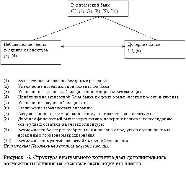 Банковская холдинговая компания, подобно банку, может быть представлена одновременно как консолидированный балансовый отчет, как регулируемая фирма и как диверсифицированный поставщик финансовых услуг70. Этот подход позволяет удобно и логично построить формат для анализа рисков холдинга. Этот же подход позволяет расширить представление о банковском холдинге, добавив в него небанковские дочерние компании. Основные трудности фактической реализации этого подхода были трудности чисто технические и организационные. Юридически этот подход мог быть реализован уже давно, но эффективное применение соответствующих законов вновь усложнялось трудностями техническими. Широчайшее распространение и доступность мощной компьютерной техники и особенно компьютерных сетей, на наш взгляд, привело к актуализации применения этого подхода к отношениям коммерческого корпоративного банка с его клиентурой. Можно называть эту совокупность организаций с банком в центре фактическим, виртуальным или псевдо-холдингом. Дополнительные возможности такой структуры в сфере риск-менеджмента на рисунке 16. По-видимому, юридическое оформление этого нового типа организаций требует значительного времени и, главное, постепенного накопления знаний и опыта, но уже сегодня можно применять такой подход для построения моделей совокупной оценки рисков банка и его клиентуры как внутренний инструмент риск-менеджмента в самом банке и как опцион для его наилучших клиентов, формирующих собою так называемую корневую клиентуру. Суть этого опциона может состоять в том, что банк и клиент сознательно идут на усиление связей и повышение уровня взаимного доверия, главным образом, в интересах повышения совокупной финансовой стабильности.