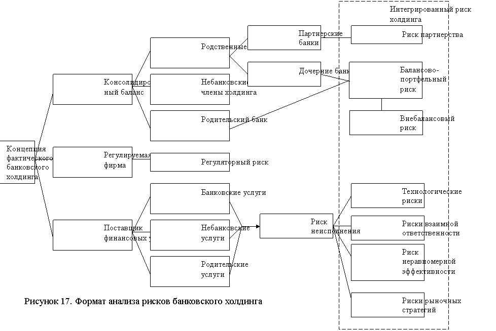 Формат анализа рисков рассматриваемой структуры может быть показан рисунком 17. Риски и возможности управления ими порождаются всеми тремя упомянутыми выше ипостасями холдинга. Совокупный риск фактического холдинга складывается из всех этих источников. Основная идея данной работы в том и состоит, чтобы очертить и в меру сил исследовать этот совокупный риск, в поиске путей органичной интеграции его компонент, не сводя все только к чисто банковским рискам, как трактует традиционная теория банковского дела. Введением в рассмотрение групп рисков партнерства, взаимной ответственности, неравномерной эффективности и различия рыночных стратегий участников холдинга мы показываем новый аспект, чреватый большими выгодами и некоторыми опасностями, причем опасности кажутся гораздо меньшими, чем выгоды. Эта возможность главным образом проистекает из новых информационных технологий.