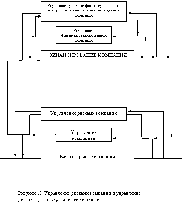 Качественно коммерческий банк и его корпоративные клиенты, все-таки, существенно разные по особенностям их бизнесов: одни управляют рисками определенного производства, а другие – рисками финансирования этого производства (см. рисунок 18). Поэтому, возможно, при согласовании рискованности их отношений придется работать в направлении согласования несколько различных форматов. Базельский формат более ориентирован на особенности банков, а COSO – более на корпорации. В дальнейшем требуется развитие обоих форматов в направлении их слияния в духе гармонизации интересов обоих типов участников договорных отношений. Это широкая теоретическая проблема, хотя и выходящая в общем виде за пределы данного исследования, требующая, однако, констатации и рассмотрения в границах темы, так как при внедрении Базельских требований потребуется дружелюбный учет потребностей клиентуры. И для банков и для корпораций требуется последовательное внедрение и организационное обустройство соответствующих форматов, к которым следует добавить и те идеи, которые образуются на пересечении потребностей и особенностей банка и клиента.