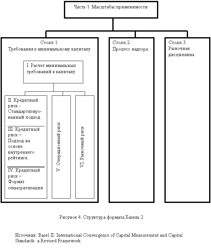 Общие цели формата Базель 2 состоят в обеспечении адекватной капитализации банков и в стимулировании усовершенствований в банковском риск-менеджменте таким образом, чтобы усилить стабильность банковской системы в целом. Эти цели достигаются введением «трех столпов» (three pillars), которые, поддерживая друг друга, создают в банках стимулы к усилению процессов внутреннего контроля. Первый столп представляет собой серьезно развитый каркас оценки минимального капитала банков, основы которого были предложены соглашением Базель 1, а второй и третий столпы – это содержательно новые компоненты. Структура формата представлена на рисунках 4 и 5.