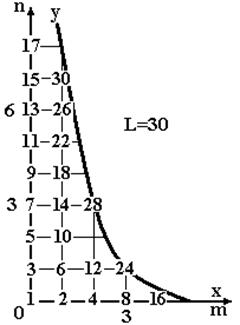 Переход к представлению на рис.2.4 позволит изображать исходные номера каналов в узлах сетки координат и оперировать целочисленными точками заданной области квадранта, ограниченной кривой: