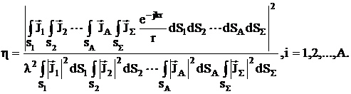 Снова воспользуемся результатами теории синтеза излучающих систем. Можно провести интегральную оценку связи между элементами излучающей системы, образовав с помощью предварительно определенных полных на излучателях и наведенных на рассеивателях токов функционал: