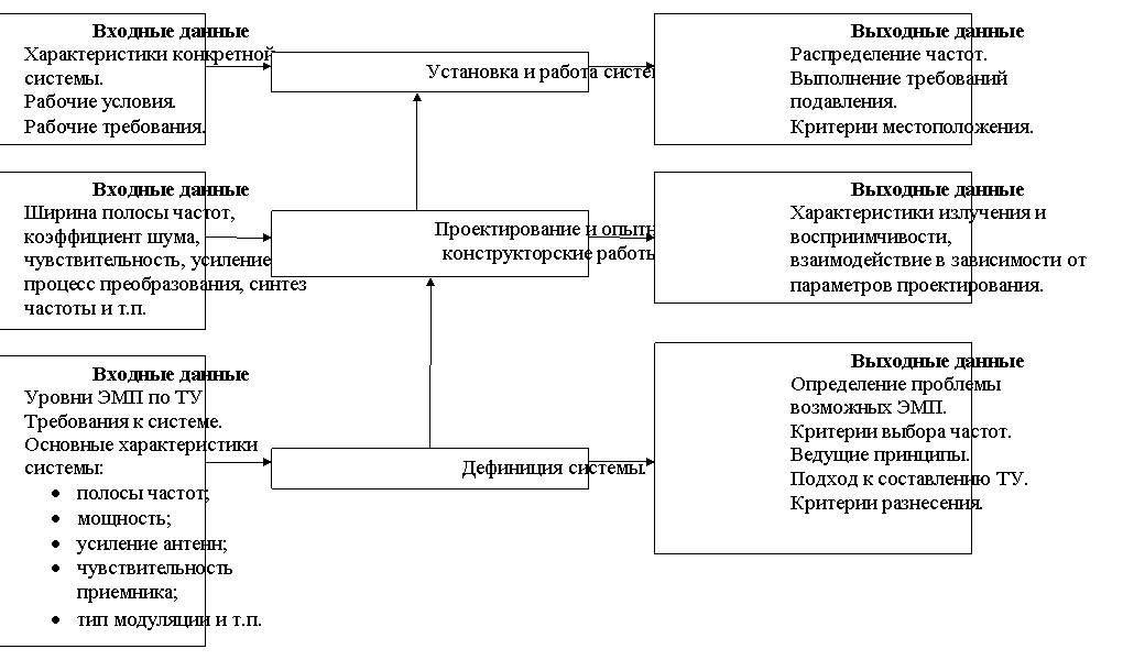 При разработке каждого прибора существует множество важных факторов, включая электромагнитную совместимость, которые должны рассматриваться. Например, в случае приемной аппаратуры необходимо определить число усилительных и преобразующих каскадов, которые будут использоваться, и установить распределение усиления, избирательности и чувствительности между этими каскадами. Еще более важно разработать общую схему приемной аппаратуры с полным описанием усиления, частотных характеристик, входных и выходных импедансов, динамического диапазона и уровней восприимчивости для каждого каскада. Инженеры, ответственные за проектирование и разработку системы, озабочены, главным образом, проблемами ЭМП в интрасистеме. В результате они должны заниматься ЭМП, возникающими при внешнем воздействии антенн различных элементов системы, а также при внутреннем взаимодействии кабелей, излучениях через корпус, проникновения через корпус и т. п.
