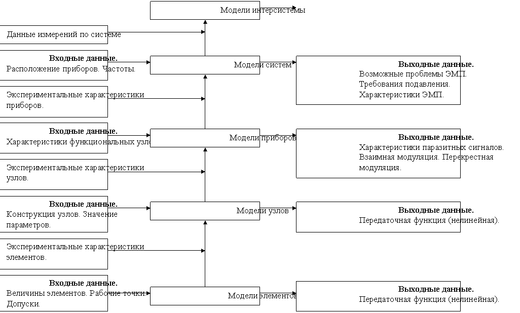 Поскольку анализ ЭМП интерсистемы касается взаимодействия приборов, подсистем и систем, он зависит в значительной степени от моделей, используемых для представления характеристик приборов. Если имеются подходящие математические модели и входные данные (информация), можно было бы, по-видимому, начать анализ электромагнитных помех на уровне элементов. Однако следует учитывать, что в большинстве случаев нежелательно или непрактично моделировать проблему ЭМП на таком уровне, т. е. уровне деталей. Вместо этого часто лучше основывать модели приборов на данных измерений. К сожалению, во многих случаях это также проблематично, так как имеющиеся способы измерений и данные могут не удовлетворять требованиям аналитических моделей.