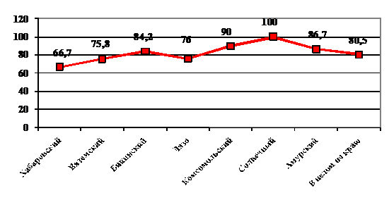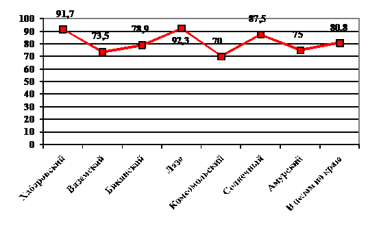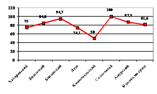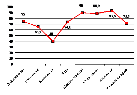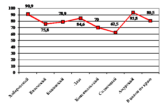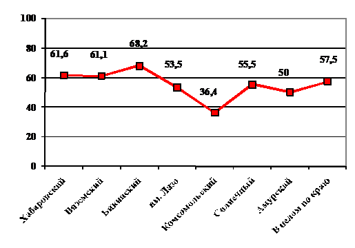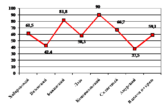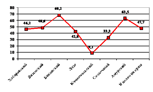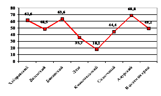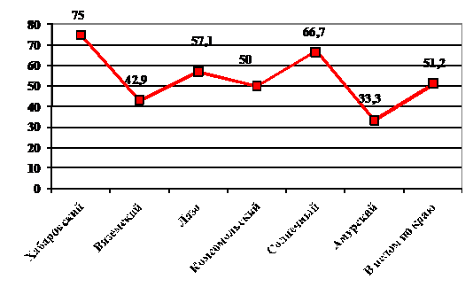 Наиболее благоприятной экономическую ситуацию в своем районе, с точки зрения влияния ее на свой бизнес, считают предприниматели Хабаровского (61,5%) и в Вяземского (40%) районов. Наименее позитивно оценивается ситуация предпринимателями в Комсомольском районе и районе им. Лазо, где около 1/3 опрошенных (27,3% и 34,5% соответственно) считают, что ситуация не только не стимулирует, но и тормозит развитие их бизнеса. Наиболее застойной в глазах предпринимателей выглядит экономическая ситуация в Солнечном районе, подавляющее большинство которых (77,8%) не видят стимулов для развития своего бизнеса в районе.