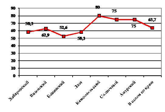 Повышение ответственности (вплоть до суда) контролирующих и регулирующих органов за помехи бизнесу предлагают в среднем по Хабаровскому краю 42,6% опрошенных. Из них Комсомольский (63,6%), Амурский (62,5%), Бикинский (50,0%) районы показали больший процент.