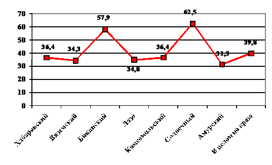 Как видно из представленной таблицы, молодые предприниматели в возрасте до 30 лет составляют небольшую, практически статистически незначимую группу – 5,1% в целом по краю, и то они имеются лишь в Хабаровском, Вяземском и им. Лазо районах. На самый активный и продуктивный для начала бизнеса возраст (30-39 лет) приходится в целом менее 1/5 предпринимателей от общего числа опрошенных. Более благополучны в этом отношении Хабаровский, Вяземский, Бикинский и Амурский районы, где эта возрастная группа составляет ¼ часть респондентов. Большинство же предпринимателей относится к старшей возрастной группе (старше 50 лет) и составляет в целом по краю 44,1%, особенно это характерно для Комсомольского района (72,7%).