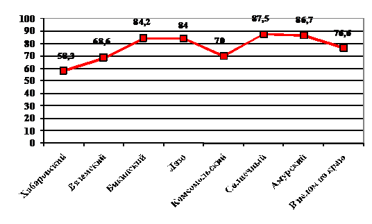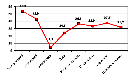 Как видно из представленной выше таблицы, большинство опрошенных предпринимателей Хабаровского края дают пессимистическую оценку состояния предпринимательства в своих районах (62%): низкий и очень низкий уровень. Несколько более оптимистичны в своих оценках предприниматели «южного куста»: Хабаровского, Вяземского и Амурского районов, практически половина из них дают позитивную оценку состоянию предпринимательства в своих районах. В остальных районах, по мнению участников опроса, дела в сфере предпринимательской деятельности обстоят значительно хуже, более половины опрошенных дают негативную оценку: Комсомольский район – 81,8%, Солнечный район – 77,8%, Бикинский район – 72,7%, район им. Лазо – 69,6%.