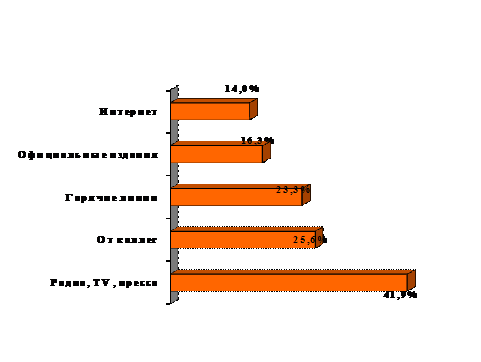 В-пятых, информацию по поддержке своего бизнеса предприниматели получают в основном из СМИ, от коллег и по «Горячей линии властных структур». И то, в целом, лишь меньшая часть предпринимателей используют информационные каналы.