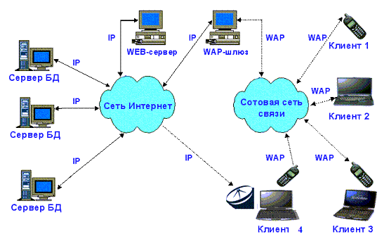 - запросы пользователей поступают от WML-браузеров клиентов и проходят через сотовую сеть связи и WAP-шлюз;