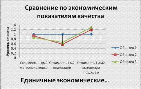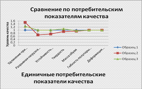 Была проведена оценка показателей качества по относительным показателям. Для более информационной оценки качества пакетов материалов образцов мужских полуботинок были построены графики сопоставления показателей качества технологических, потребительских и экономических единичных показателей качества. По графикам было видно, что часть относительных единичных показателей выше единицы, а часть ниже единицы, поэтому нет возможности сделать выбор образца наиболее высокого качества. Чтобы объективно оценить качество образцов мужских полуботинок был рассчитан комплексный показатель качества. По результатам оценки можно сделать вывод, что по потребительским и технологическим и экономическим показателям качества 3 пакет материалов (комплексная оценка качества равна 3,03) превышает показатели качества 2 пакета материалов (комплексная оценка качества равна 2,6) и 1 пакета материалов - базового (комплексная оценка качества равна 3).
