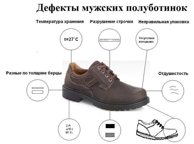 3. В качественном анализе представлено подробное описание внешнего вида модели. Для контрольных проверок и периодических испытаний из партии ботинок сделана выборка от общего числа пар обуви в партии, прошедшей проверку по внешнему виду. Органолептическим методом проведена идентификация объекта экспертизы в соответствии с нормативно-технической документацией, определены линейные размеры обуви и ее деталей. Рассмотрены внешний вид полуботинок, физико-механические свойства материалов, швы соединения деталей верха, подкладки. При нормальном контроле качества обуви на 6 парах выявлен ряд дефектов, связанных с нарушением технологии заготовки сырья допустимых стандартом. На одной паре обуви выявлены дефекты нарушения технологии при изготовлении, недопустимых стандартом (отклеивание подошвы и разный цвет подошвы), партия продукции принимается для реализации, т. к. число браковочных пар обуви не превышает приемочного числа.