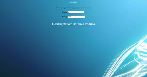 Интерфейс пациента является ярким примером массового интерфейса. Начало восприятия информации начинается с его фона, для этого была выбрана классическая цветовая композиция синего с белым, с элементами желтого цветов. Начальная страница содержит буквально две ссылки: «Получить талон», «Справка и помощь». Основная линия сценария, конечно же идет по ссылке «Получит талон» (рис.1), где происходит авторизация пациента по № медицинского полиса, ввод которого не обязателен. В программном коде встроена процедура, которая позволяет отредактировать введенные данные: если серия и номер заполнены в одной строке, если добавлены лишние символы не характерные для № полиса.