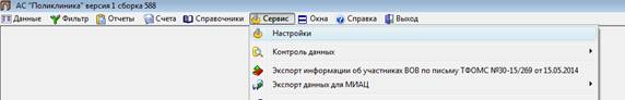 Специалистам МО необходимо провести настройку АС «Поликлиника» на каждом рабочем месте, на котором будет использоваться ПАК ЭО. Для этого пройдите в основное меню Сервис/Настройки (рис. 1).