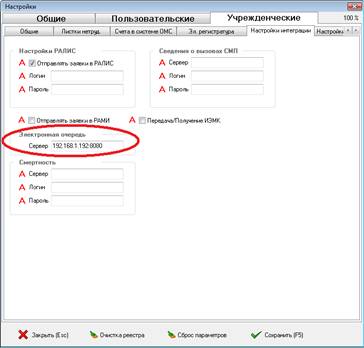 В отобразившемся окне настроек, во вкладке «Учрежденческие», выберите вкладку «Настройки интеграции» (рис. 2). На вкладке «Настройки интеграции» в группе «Электронная очередь» в поле «Сервер» заполните адрес сервера, на котором установлен ПАК ЭО, и, при необходимости, укажите порт. После заполнения поля нажмите кнопку «Сохранить».