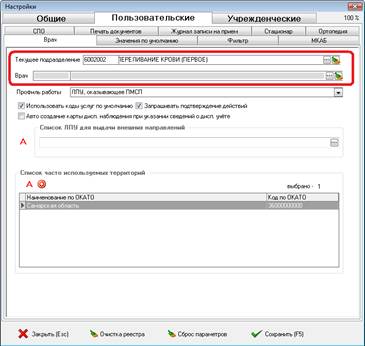 В окне настроек на вкладке «Пользовательские/Врач» укажите ваше подразделение и ваш код врача, как показано на рисунке 3. Нажмите кнопку «Сохранить». Это действие необходимо выполнить для того, чтобы при каждом открытии программы в «Журнале записи на прием» не надо было выбирать код врача, который ведет прием.
