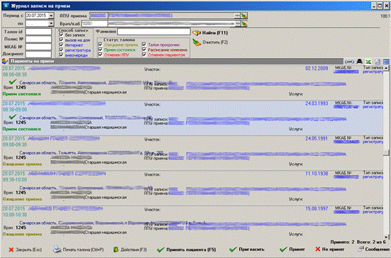 В появившемся окне формы «Журнал записи на прием» отображаются записи о пациентах, которые были записаны на прием различными способами записи, как показано на рисунке 5.
