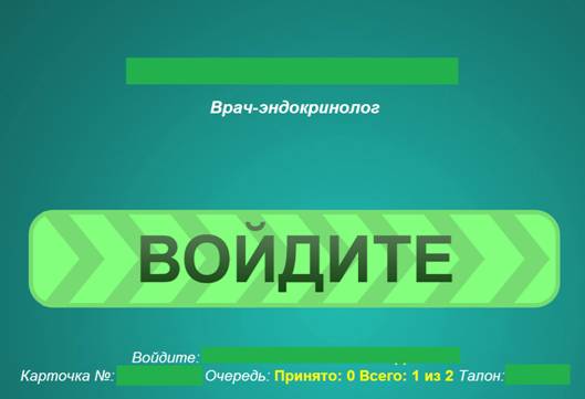 Нажмите кнопку «Пригласить», чтобы на дисплее ПАК ЭО отобразилась надпись «Войдите», и данные талона пациента, которые определены Разработчиками ПАК ЭО для вывода на экран во время настройки ПАК ЭО.