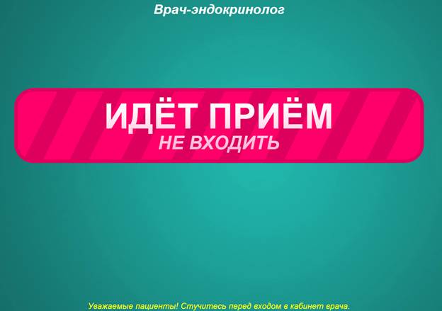 Нажмите кнопку «Сообщение», чтобы вывести информацию для пациентов на экран ПАК ЭО. В отобразившемся окне введите текст сообщения и нажмите кнопку «Сохранить». После этого текст, введенный в окне, отобразится на экране ПАК ЭО в нижней части (рис. 8). Например: «Уважаемые пациенты! Стучитесь перед входом в кабинет врача.».