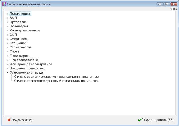 Выберите пункт «Электронная очередь» в нем выберите пункт требуемый отчет: «Отчет о времени ожидания и обслуживания пациентов» или «Отчет о количестве принятых/неявившихся пациентов» и нажмите кнопку «Сформировать».