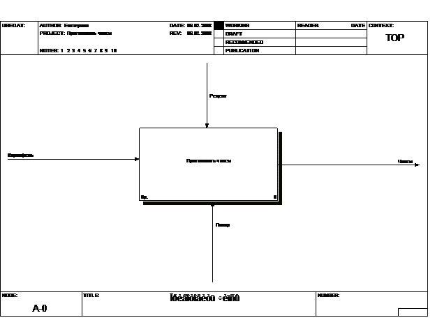 В основном используют в процессе моделирования на верхнем уровне. Пример «Приготовить чипсы » можно рассмотреть как нотацию данной методологии. Графически представляет собой четырехугольник, изображающий функции. Стрелки, входящие в функцию слева, служат для описания потоков материальных ресурсов или потоков информации, документов. Входящие ресурсы преобразуются функцией. Результатом этого преобразования являются материальные выходы или информация, которые показываются в виде стрелок, выходящих из правой стороны четырехугольника.