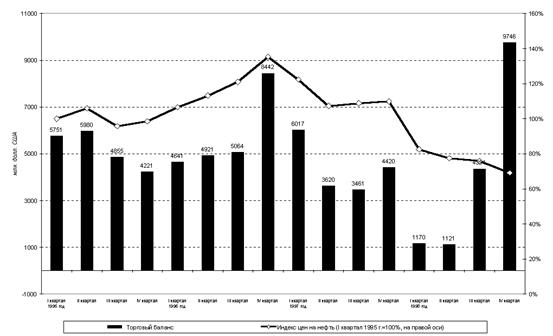 Торговый баланс РФ и мировые цены на нефть в 1995 - 1998 гг.