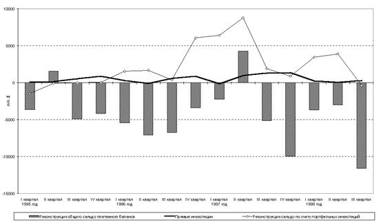 Анализ реконструированного платежного баланса России за 1997 год показал значительное снижение сальдо по счету портфельных инвестиций в IV квартале до 906 млн. долл. США (0,72% ВВП) и общего сальдо платежного баланса до -9,9 млрд. долл. США (-7,9% ВВП). Таким образом, динамика портфельных иностранных инвестиций имела резкий перелом осенью 1997 года. Наряду с ухудшением конъюнктуры цен на основные товары российского экспорта этот фактор в конце 1997 - первой половине 1998 года привел к катастрофическому росту дефицита платежного баланса, финансируемого за счет снижения внешних резервов ЦБ РФ.