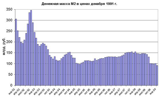 Кризисное состояние не является чем-то новым для России. Собственно, в состоянии кризиса страна существует вот уже более 10 лет. Однако на протяжении 1995-1997 годов наблюдались определенные положительные сдвиги, которые стали особенно заметны к середине 1997 года. Месячная инфляция измерялась десятыми долями процента, выросла реальная денежная масса (см. рис. 1.1), снизились номинальные и реальные процентные ставки, стал увеличиваться объем кредитов банков реальному сектору. Все это привело к прекращению спада и началу экономического роста. Благоприятные сдвиги наметились в структуре промышленности: в 1997 году наиболее быстрыми темпами росли отрасли, ориентированные на внутренний спрос (машиностроение, и особенно автомобилестроение, химическая, медицинская, полиграфическая, отдельные сектора легкой и пищевой промышленности), то есть способные конкурировать с иностранными производителями в условиях отсутствия жестких протекционистских ограничений. На этом фоне происходило некоторое улучшение социальных индикаторов - снижались уровень преступности, заболеваемость, стабилизировалась продолжительность жизни.