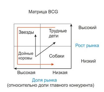 Основываясь на соотношении между темпом роста рынка для данного товара и уже существующим для него объемом рынка. Бостонская консультационная группа (БКГ) выделила четыре позиции, которые товар может занимать на рынке. Приведенная рядом схема называется «бостонская матрица». Каждый продукт имеет свой жизненный цикл и может проходить через все названные позиции, как показано стрелкой на рисунке. Вместе с тем у любого продукта могут быть и иные траектории развития