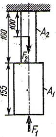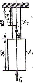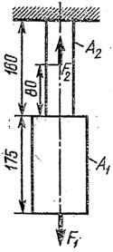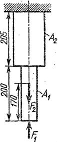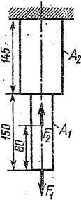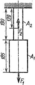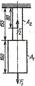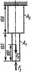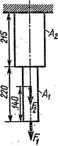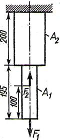 Задание: Для заданного двухступенчатого стального бруса, нагруженного двумя силами F1 и F2 , построить эпюры продольных сил (Nz). Определить площади поперечных сечений и диаметр каждой ступени бруса из условия прочности; построить эпюры нормальных напряжений; определить удлинение (укорочение) каждой ступени и найти перемещение свободного конца бруса.