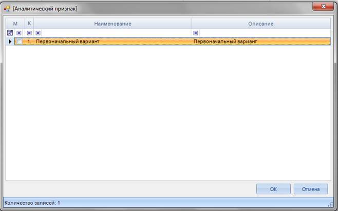 Для выбора аналитического признака необходимо дважды щёлкнуть левой кнопкой мыши на пересечении столбца «Значение» и строки «Справочники - Аналитический признак». Откроется соответствующий справочник, в котором выбирается необходимое значение двойным щелчком левой кнопки мыши. Аналитический признак необходим для фиксирования версии проектирования бюджета.
