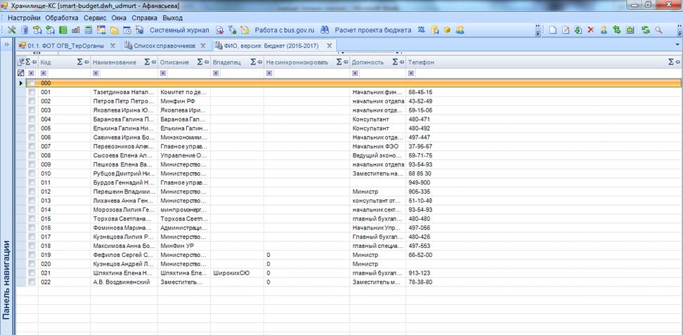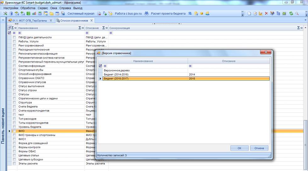 и заходим в Список справочников. В списке находим справочник с наименованием «ФИО». Заходим в него двойным нажатием левой кнопкой мыши. При этом при вопросе выбора версии справочника, выбираем версию «Бюджет (2015-2017)».
