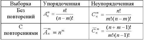 Упорядоченная выборка из n элементов по m называется размещением, неупорядоченная выборка из n элементов по m называется сочетанием. Число размещений и сочетаний c повторениями и без повторений из n элементов по m можно найти из следующей таблицы.