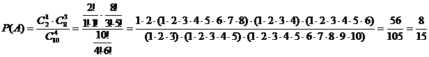 Пример 5. Два счета из десяти выполнены с ошибками. Найти вероятность того, что из четырех взятых на проверку счетов один счет окажется с ошибками.