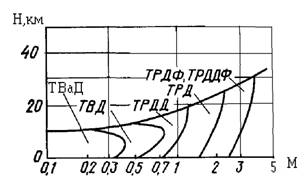 Рис.9. Области применения газотурбинных двигателей по скорости и высоте полета: