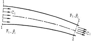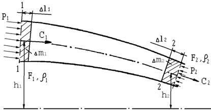 Выделим в установившемся потоке газа произвольную струйку (рис.13). Пусть в сечении струйки «1» трубка тока имеет площадь F1 , скорость движения C1, плотность газа в этом сечении r1 , давление р1. Сечение «1» расположено на высоте h1 относительно условного уровня. В сечении «2», расположенном на высоте h2, параметры соответственно равны C2, F2, r2, р2.