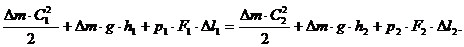 Как было сказано ранее (см. п.2.3), через стенки струйки не происходит переноса энергии. Но на выделенный объем, заключенный между сечениями «1» и «2», оказывают влияние силы, обусловленные давлением газа р1 и р2. С учетом этого можно сказать, что энергия газа в сечении «1» (Е1) будет отличаться от энергии в сечении «2» (Е2) на величину работы сил от давления газа. Работу этих сил можно определить по формулам: