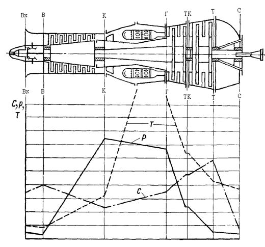 Рис. 21. Схема проточной части двигателя ТВ2-117 и изменение параметров воздуха (газа):
