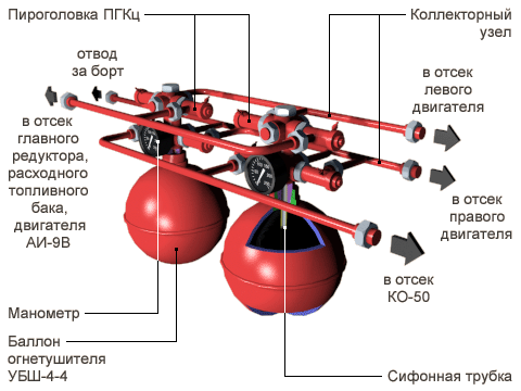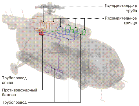 Противопожарное оборудование вертолета состоит из системы сигнализации о пожаре и системы пожаротушения.