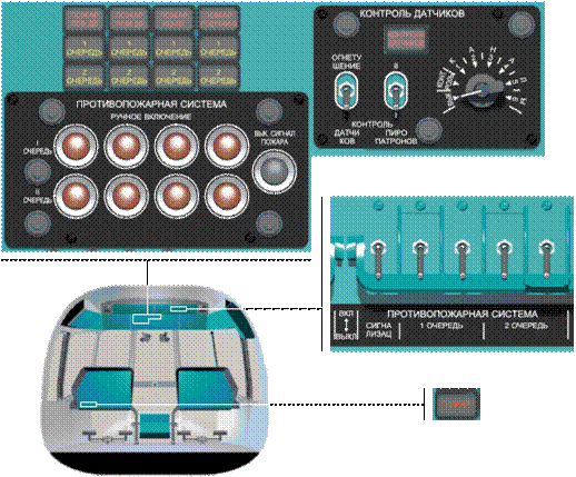 2. горят табло на приборной доске и все 4 табло сигнализации пожара в отсеках;