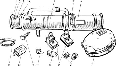 В комплект керосинового обогревателя КО-50 (рис.12.3) входят: обогреватель 5, вентилятор 6, топливная коробка 7, два пневмореле 8, блок управления регулятора температуры 13, электромагнитный клапан 11, два приемника температуры 9, задатчик температуры 12, агрегат зажигания, два датчика температуры 4, два термопереключателя 1,3 и термовыключатель 2.