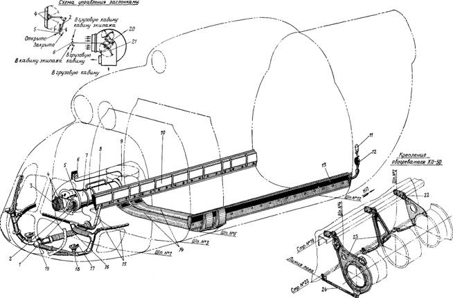 1,3— сетки; 2, 4— заслонки; 5— рукоятка управления заслонками воздухозаборника и забора воздуха из грузовой кабины; 6— рукоятка управления заслонками распределителя; 7— вентилятор обогревателя; 8— обогреватель КО-50; 9— распределитель; 10— правый короб; .11— фильтр-отстойник воздушной системы; 12— раструб обогрева фильтра-отстойника; 13— левый короб; 14— соединительные трубы; 15— короба обдува передних стекол и блистеров; 16— трубопровод; 17— рукоятка управления заслонкой патрубка подачи воздуха к ногам летчика; 18—заслонка патрубка подачи воздуха к ногам летчика;. 19— передний патрубок; 20— дифференциальный механизм; 21— заслонка распределителя; 22— вильчатый болт; 23— кронштейны; 24— тяга