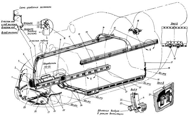 1— сетка; 2— заслонка воздухозаборника; 3— заслонка вентиляции с ручкой управления; 4— вертикальный трубопровод; 5— рукоятка управления заслонками распределителя; 6— рукоятка управления заслонкой воздухозаборника; 7— заслонка; 8— вентилятор обогревателя; 9— распределитель; 10— дифференциальный механизм; 11— правый вентиляционный короб; 12— левый вентиляционный короб; 13— сдвижная заслонка; 14— поперечный трубопровод; 15— патрубки индивидуального обдува пассажиров; 16— вентилятор; 17— фильтр-отстойник воздушной системы; 18— раструб обогрева фильтра-отстойника; 19— левый отопительный короб; 20— правый отопительный короб; 21— заслонки отопительных коробов; 22— патрубок-эжектор рециркуляции; 23— приемный патрубок; 24— соединительные трубы; 25— короба обдува стекол и блистеров; 26—трубопровод; 27— рукоятка управления заслонкой патрубка подачи воздуха к ногам летчика; 28—заслонка патрубка подачи воздуха к ногам летчика; 29— передний патрубок