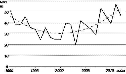Зерновой сектор является стратегической отраслью экономики Украины, которая определяет объем предложения и стоимость основных видов продовольствия для населения страны, формирует значительную часть доходов сельскохозяйственных производителей, определяет состояние и тенденции развития сельских территорий, формирует валютные поступления за счет экспорта. Зерновая отрасль рассматривается как база и источник устойчивого развития большинства отраслей агропромышленного комплекса и основа аграрного экспорта. Анализ данных о производстве зерновых культур в Украине (пшеницы, кукурузы, ячменя, ржи, гороха, гречки и др.) показывает, что после кризиса 90-х годов наблюдается постепенный рост объемов их производства с 24,5 млн. т. в 2000 г. до 56,8 млн. т. в 2011 г. и 46,2 млн. т. в 2012 г. [1]. Динамика производства зерна в Украине представлена на рис. 1.