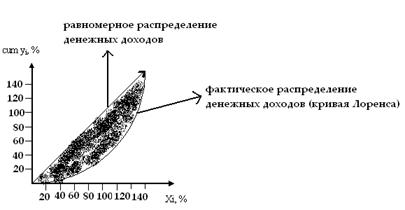 Коэффициент Джинни может принимать значения от 0 до 1, означая, при 0 – полное равенство в распределении денежных доходов между всеми группами населения; при 1 – полное неравенство. Степень неравномерности в распределении денежных доходов между всеми социальными группами населения изучают, также, с помощью кривой Лоренса. В прямоугольной системе координат по оси абсцисс откладывают удельный вес численности населения каждой i-ой группы в общей численности населения, по оси ординат – накопленный удельный вес денежных доходов каждой i-ой группы населения.