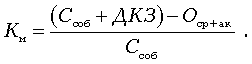 Степень способности маневрировать собственными средствами в мобильной форме характеризует коэффициент маневренности Км, который определяется как отношение суммы собственных средств и долгосрочных кредитов и займов (ДКЗ) за вычетом основных средств и иных внеоборотных активов (Оср+ак ) к величине собственных средств Ссоб :