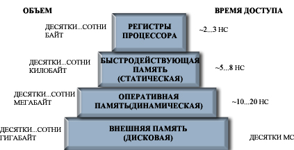 Память компьютера представляет собой иерархию запоминающих устройств, отличающихся средним временем доступа к данным и стоимостью хранения одного бита данных (рис. 2.4).