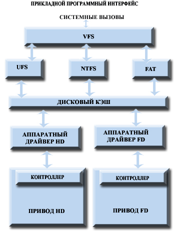 Для унификации представления различных файловых систем в подсистеме ввода-вывода может использоваться общий драйвер верхнего уровня, играющий роль диспетчера нескольких драйверов файловых систем. На рис. 2.6 в качестве примера показана структура драйверов дисковой подсистемы, реализованная в диспетчере VFS (Virtual File System), применяемом в операционных системах UNIX.
