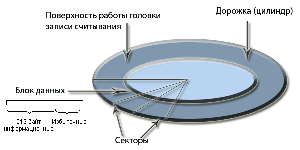 Поэтому на диске данные хранятся порциями – кодовыми блоками, имеющими информационную часть и некоторую проверочную часть. Эти блоки называют секторами (sectors), имеющими стандартизованный размер информационной части 512 байт.